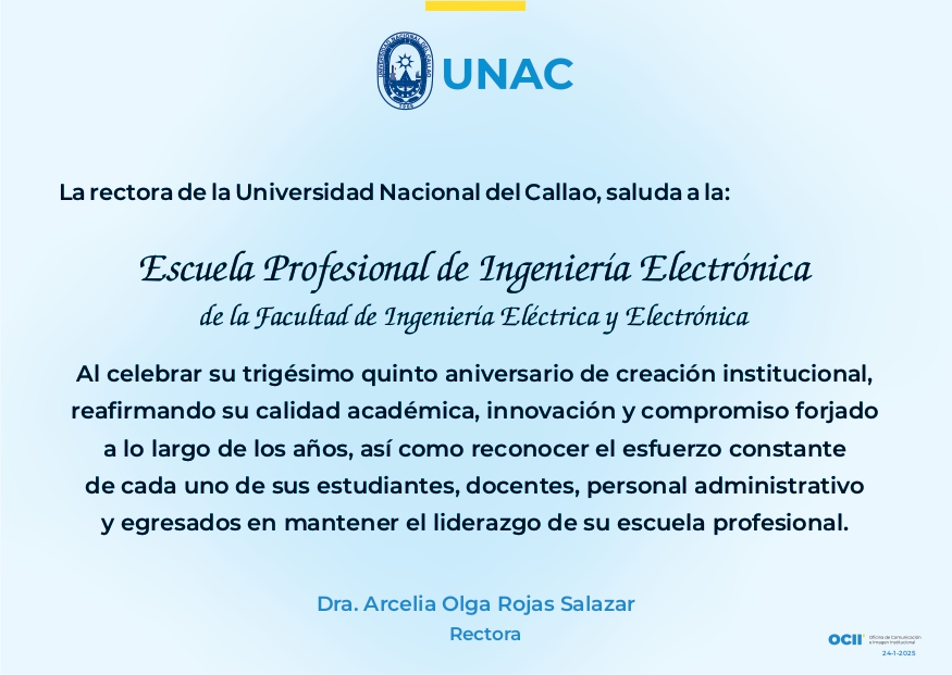 Posted on 24 de enero de 2025 Relaciones Públicas UNAC Noticias Aniversario de la Escuela Profesional de Ingeniería Electrónica de la Facultad de Ingeniería Eléctrica y Electrónica
