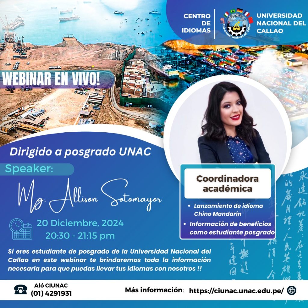 Posted on 16 de diciembre de 2024 Relaciones Públicas UNAC Noticias Centro de Idiomas: Webinar en vivo dirigido a posgrado UNAC