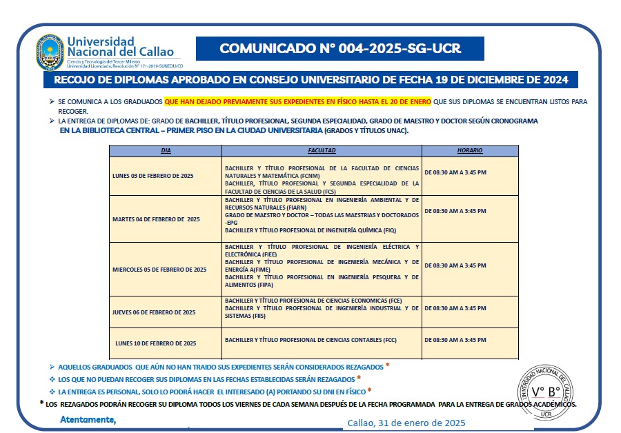 Posted on 3 de febrero de 2025 Relaciones Públicas UNAC Noticias Recojo de diplomas aprobado en Consejo Universitario de fecha 19 de diciembre de 2024.