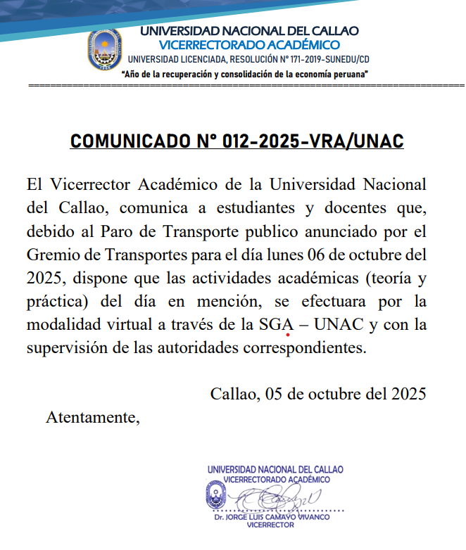COMUNICADO N° 012-2025-VRA/UNAC SOBRE AL PARO DE TRANSPORTE DEL DÍA LUNES 06 DE OCTUBRE
