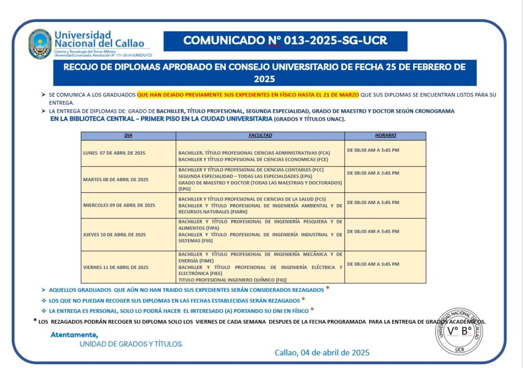 Posted on 4 de abril de 2025 Relaciones Públicas UNAC Noticias Comunicado N° 013 – 2025 – SG – UCR – Recojo de diplomas aprobado en consejo universitario de fecha 25 de febrero de 2025.