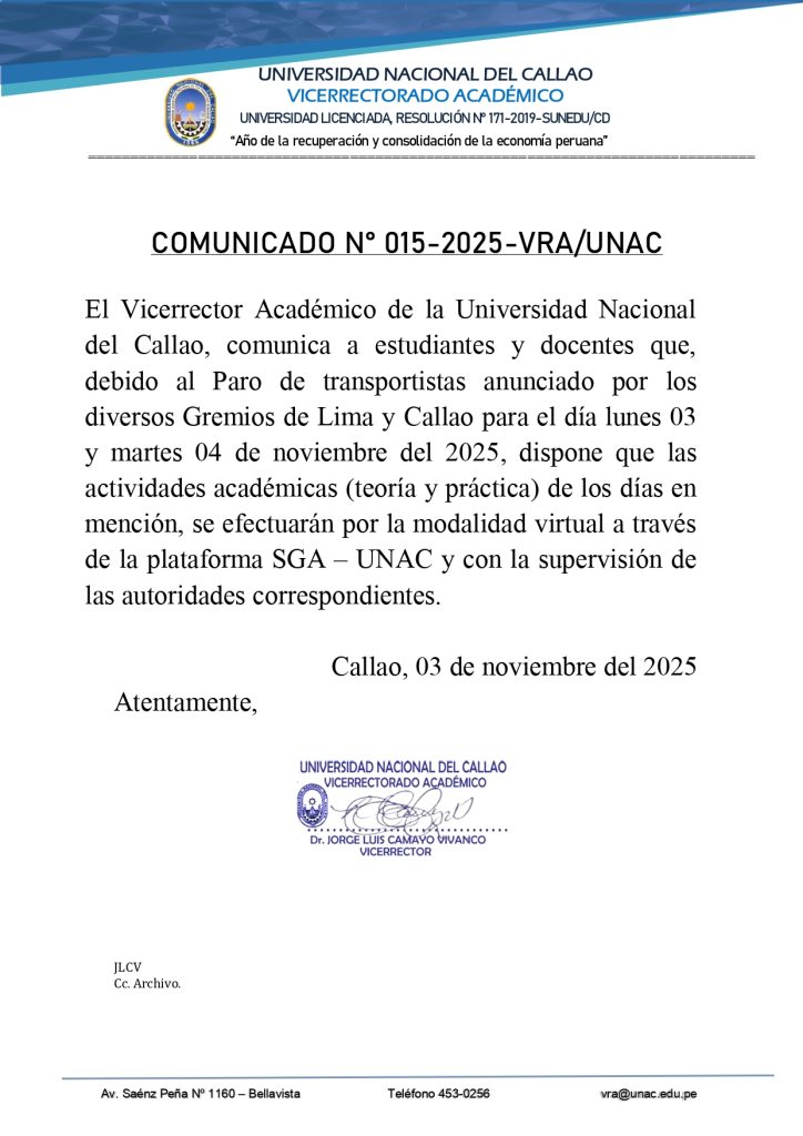 Posted on 3 de noviembre de 2025 Relaciones Públicas UNAC Noticias Comunicado N.° 015 – 2025 – VRA/UNAC