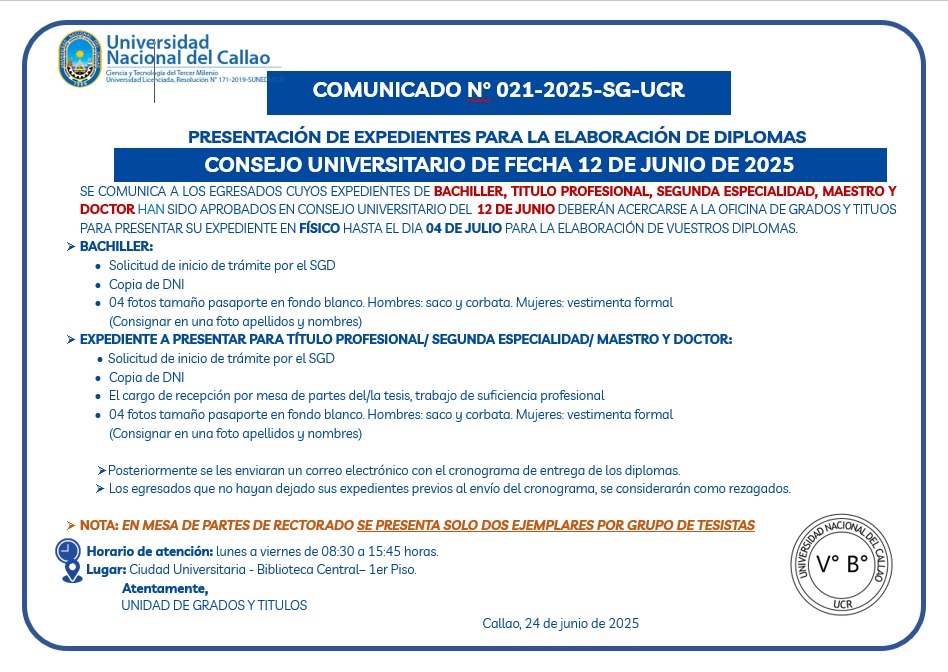Posted on 24 de junio de 2025 Relaciones Públicas UNAC Noticias Comunicado N° 021 – 2025 – SG – UCR. Presentación de expedientes para elaboración de diplomas – CU de fecha 12 de junio de 2025 BACHILLERDescarga TITULO PROFESIONALDescarga SEGUNDA ESPECIALIDAD 12 DE JUNIODescarga MAESTRO Y DOCTOR 12 DE JUNIODescarga