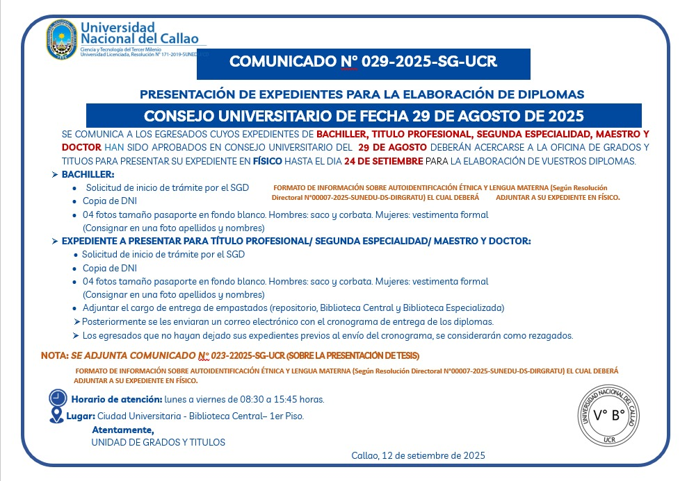 Posted on 12 de septiembre de 2025 Relaciones Públicas UNAC Noticias COMUNICADO N° 029-2025-SG-UCR (Presentación de expedientes para la elaboración de diplomas – CONSEJO UNIVERSITARIO DE FECHA 29 DE AGOSTO DE 2025)
