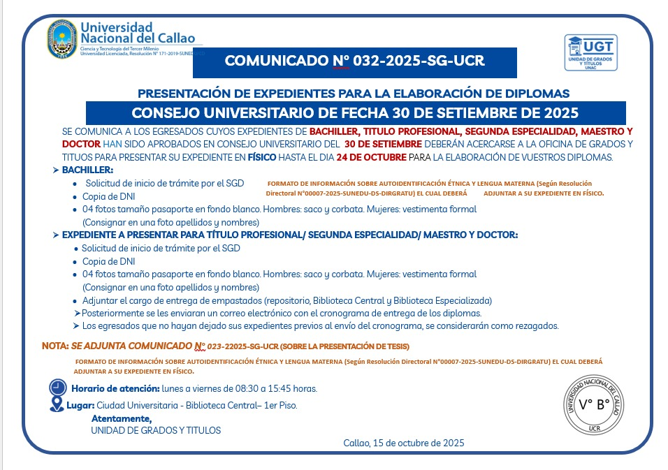 Posted on 15 de octubre de 2025 Relaciones Públicas UNAC Noticias Comunicado N° 032 – 2025 – UCR. BACH 30 DE SETDescarga TITULO 30 DE SETDescarga MAESTRO Y DOCTOR 30 SETDescarga SEGUNDA ESPECIALIDADDescarga