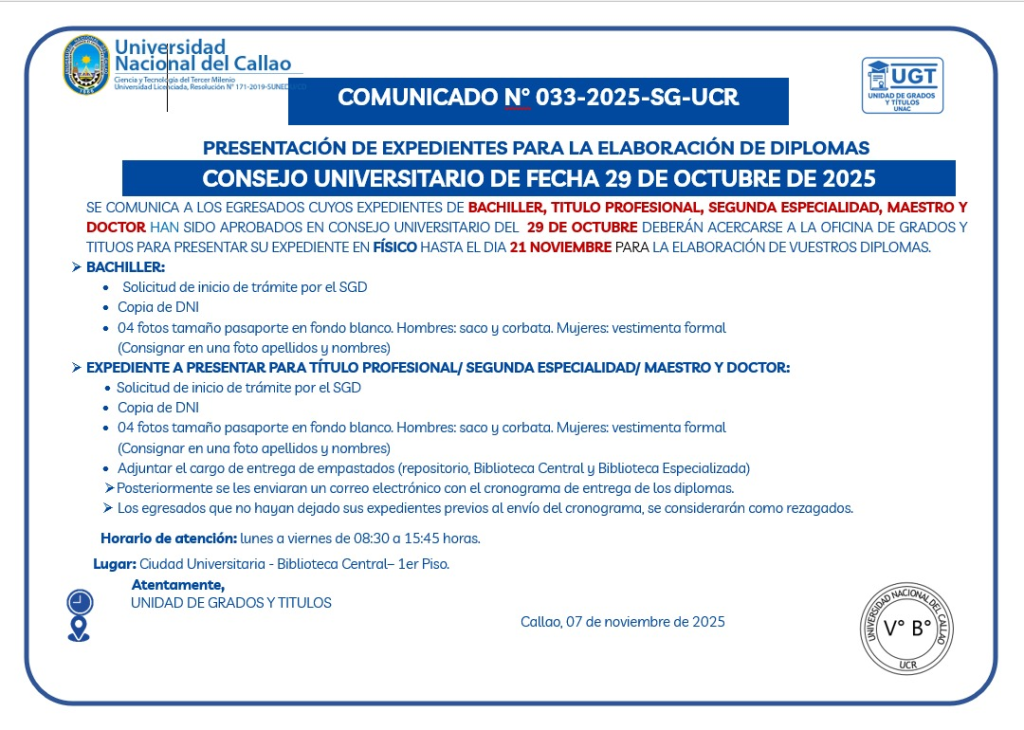 Posted on 7 de noviembre de 2025 Relaciones Públicas UNAC Noticias Comunicado N° 033 – 2025 – UCR LISTA BACH 29 DE OCTDescarga LISTA TITULO PROFESIONAL 29 DE OCT 2Descarga LISTA CU SEGUNDA ESP 29 DE OCTDescarga LISTA MAESTRO Y DOCTOR 29 DE OCTDescarga