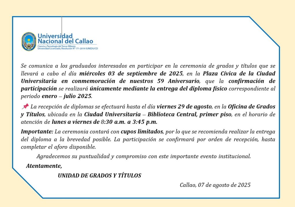 Posted on 7 de agosto de 2025 Relaciones Públicas UNAC Noticias Comunicado – Unidad de Grados y títulos.