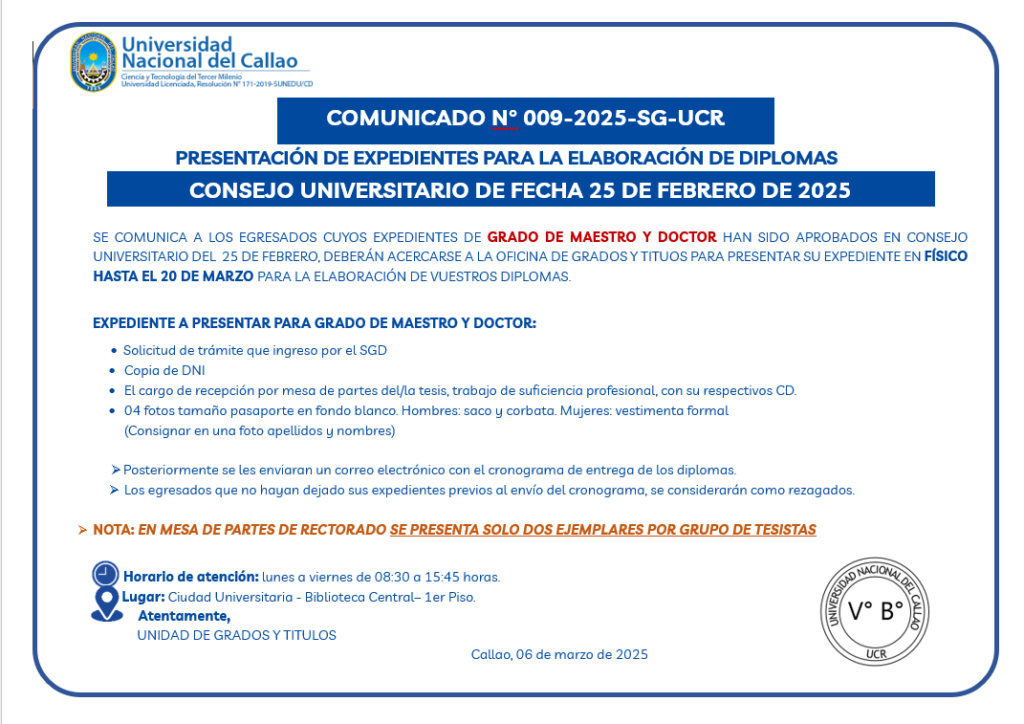 • Comunicado N° 009 – 2025 – SG – UCR. Presentación de expedientes para la elaboración de diplomas. (Consejo universitario de fecha 25 de febrero de 2025)