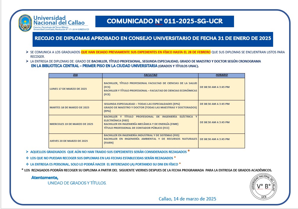 Posted on 14 de marzo de 2025 Relaciones Públicas UNAC Noticias Comunicado N° 011 – 2025 – SG – UCR. Recojo de diplomas aprobado en consejo universitario de fecha 31 de enero de 2025.
