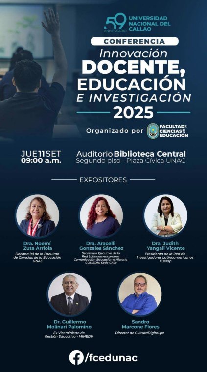 Posted on 5 de septiembre de 2025 Relaciones Públicas UNAC Noticias Conferencia Innovación Docente, Educación e Investigación 2025. Fecha: Jueves, 11 de septiembre de 2025Horario: 9:00a.m. a 12:30 p.m.