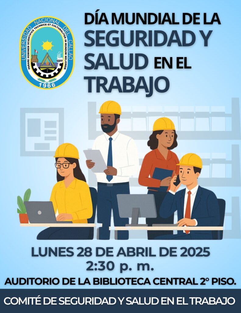 Invitamos a docentes y personal administrativo a participar del evento conmemorativo por el Día Mundial de la Seguridad y Salud en el Trabajo, que se llevará a cabo el día lunes 28 de abril de 2025 a las 2:30 p. m. en el 2do piso, Auditorio de la Biblioteca Central.