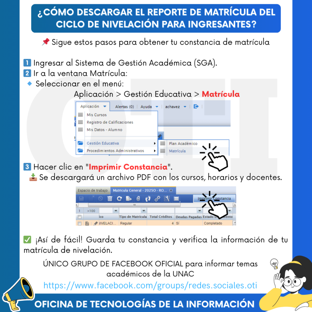Posted on 7 de marzo de 2025 admin Noticias,Pregrado ¿Cómo descargar el reporte de matrícula del ciclo de nivelación para ingresantes? ¿Cómo descargar el reporte de matrícula del ciclo de nivelación para ingresantes?📌 Sigue estos pasos para obtener tu constancia de matrícula1️⃣ Ingresar al Sistema de Gestión Académica (SGA).2️⃣ Ir a la ventana Matrícula: 🔹 Seleccionar en el menú: Aplicación > Gestión Educativa > Matrícula3️⃣ Hacer clic en “Imprimir Constancia”.📥 Se descargará un archivo PDF con los cursos, horarios y docentes.✅ ¡Así de fácil! Guarda tu constancia y verifica la información de tu matrícula de nivelación.