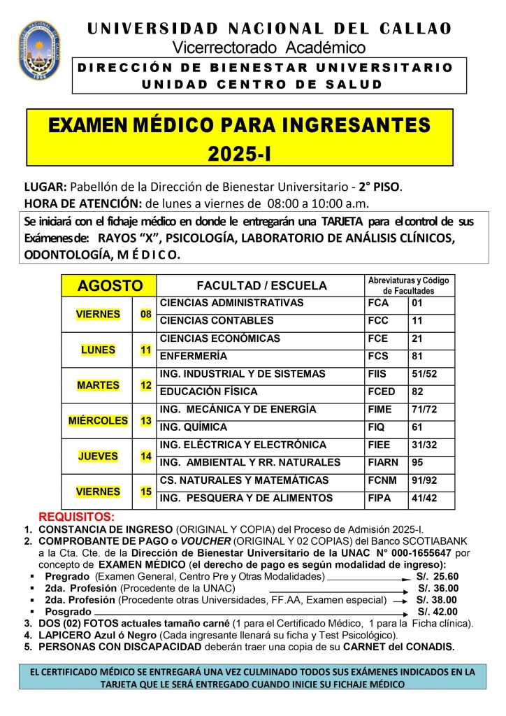 Posted on 8 de agosto de 2025 Relaciones Públicas UNAC Noticias Examen médico para ingresantes 2025-I