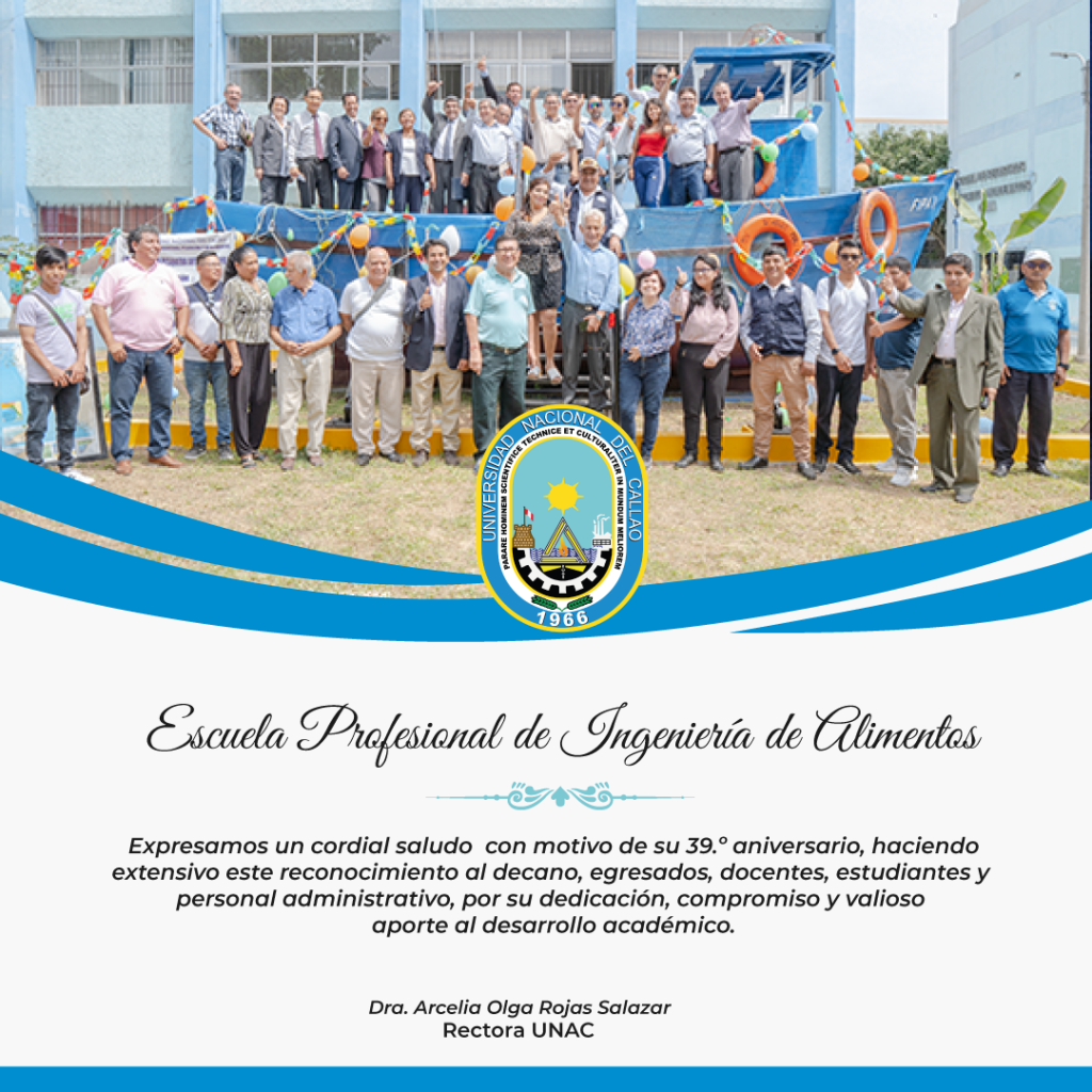 Posted on 27 de octubre de 2025 Relaciones Públicas UNAC Noticias Feliz 39.° aniversario, Escuela Profesional de Ingeniería de Alimentos.