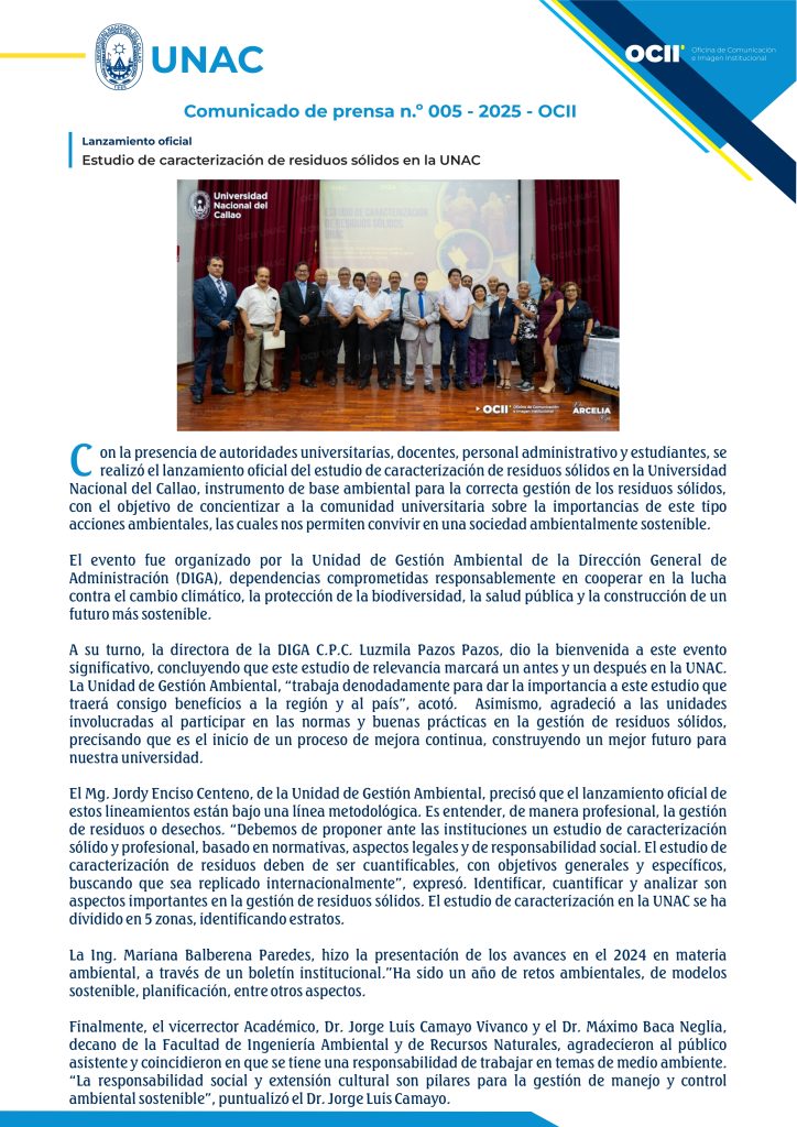 Posted on 4 de febrero de 2025 Relaciones Públicas UNAC Noticias Lanzamiento oficial – Estudio de caracterización de residuos sólidos en la UNAC