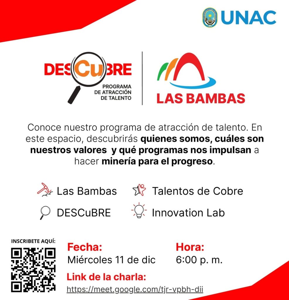 Posted on 11 de diciembre de 2024 admin Noticias LAS BAMBAS – CHARLA INFORMATIVA SOBRE EL PROGRAMA DE ATRACCIÓN DE TALENTO Dirigido a estudiantes a partir del 8vo ciclo, y egresados de los años 2023 y 2024. Link de la reunión: https://meet.google.com/tjr-vpbh-dii