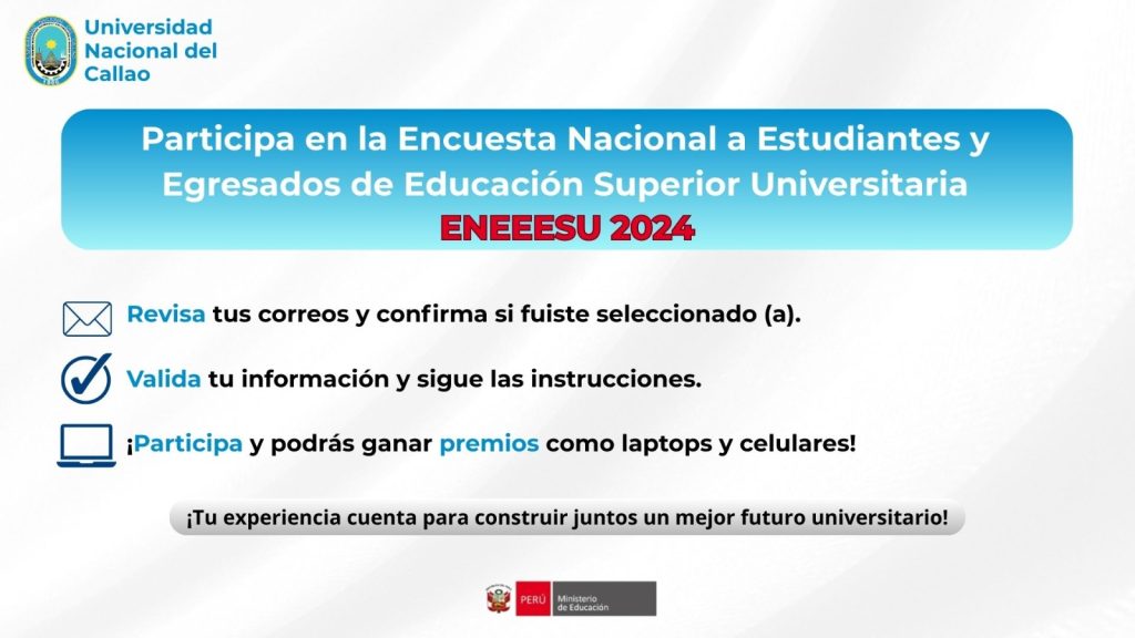 Posted on 3 de septiembre de 2025 Relaciones Públicas UNAC Noticias Participa en la Encuesta Nacional a Estudiantes y Egresados de Educación Superior Universitaria