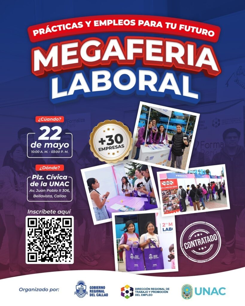 Posted on 16 de mayo de 2025 Relaciones Públicas UNAC Noticias Prácticas y empleos para tu futuro: MEGAFERIA LABORAL. Mega Feria LaboralEste 22 de mayo: 10:00 a. m. – 3:00 p. m.Plaza Cívica de la UNAC