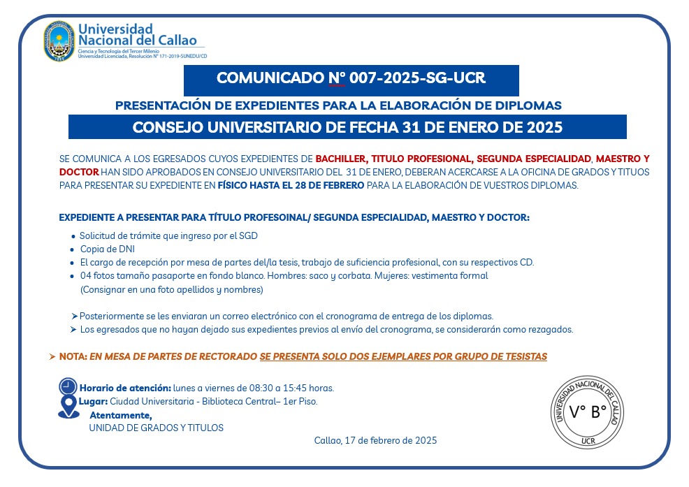 Posted on 17 de febrero de 2025 Relaciones Públicas UNAC Noticias Presentación de expedientes para la elaboración de diplomas. (CONSEJO UNIVERSITARIO DE FECHA 31 DE ENERO DE 2025) LISTA CU 31 DE ENERO BACH 2Descarga LISTA CU 31 DE ENERO TITULOS 3Descarga LISTA CU 31 DE ENERO SEGUNDA ESPECIALIDAD 4Descarga LISTA CU 31 DE ENERO MAESTRO Y DOCTOR 5Descarga