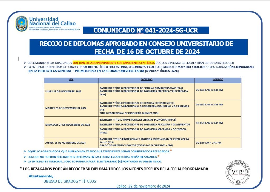 RECOJO DE DIPLOMAS APROBADO EN EL CONSEJO UNIVERSITARIO DE FECHA 16 OCTUBRE DE 2024